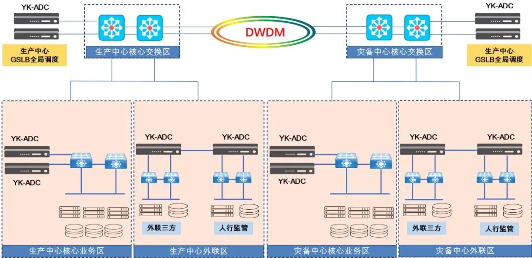 生产中心和灾备中心为对称部署,两个中心使用波分技术实现互相连接;